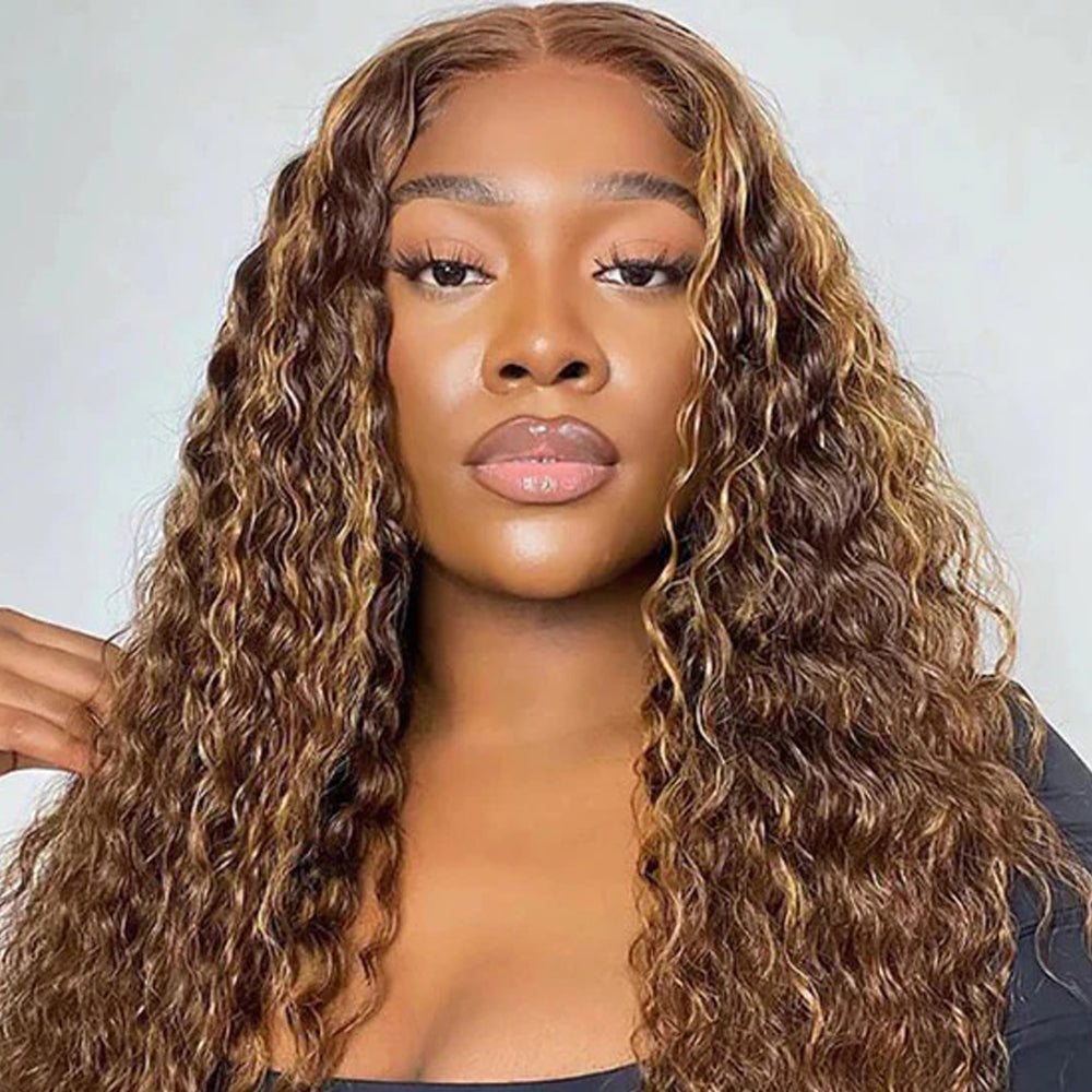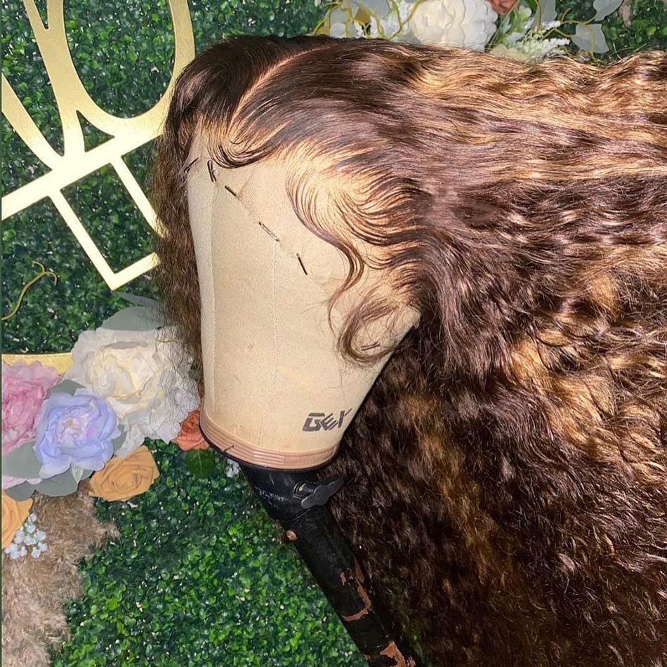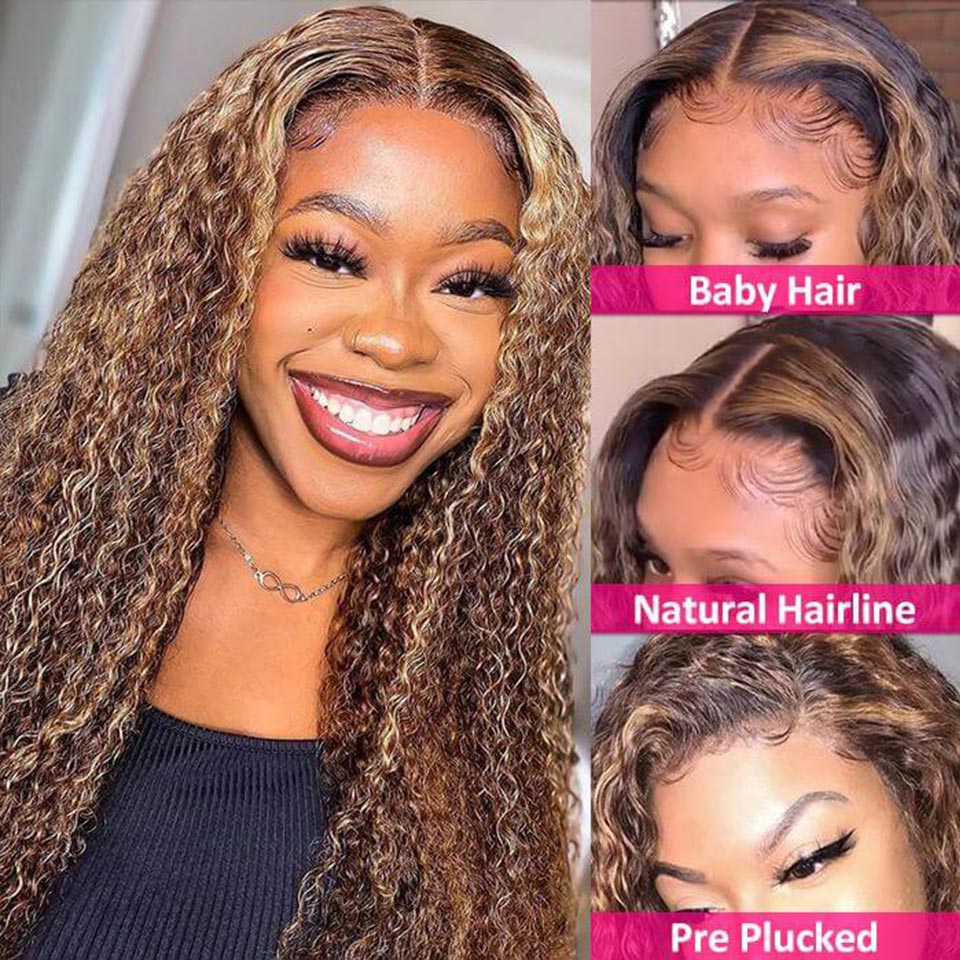 Deep Curly Color#4/27 Highlight 13×4 Full Frontal Lace Wig Pre Plucked Human Hair Wigs Glueless HD Lace Bleached Knots