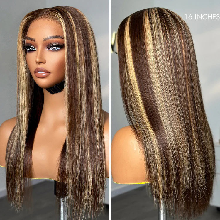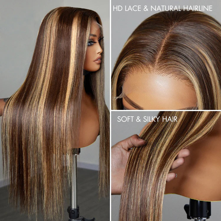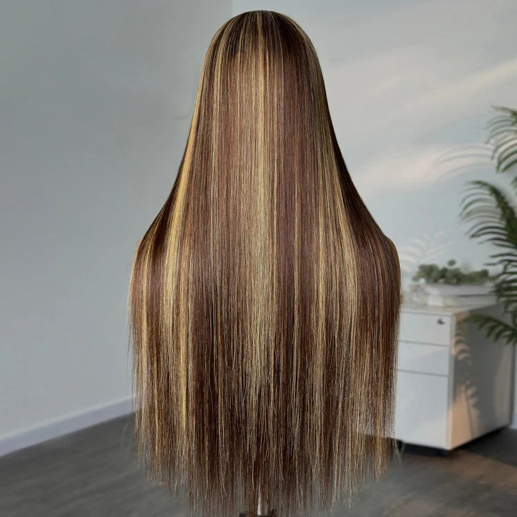 Straight Color#4/27 Highlight 13×4 Full Frontal Lace Wig Pre Plucked Human Hair Wigs Glueless HD Lace Bleached Knots